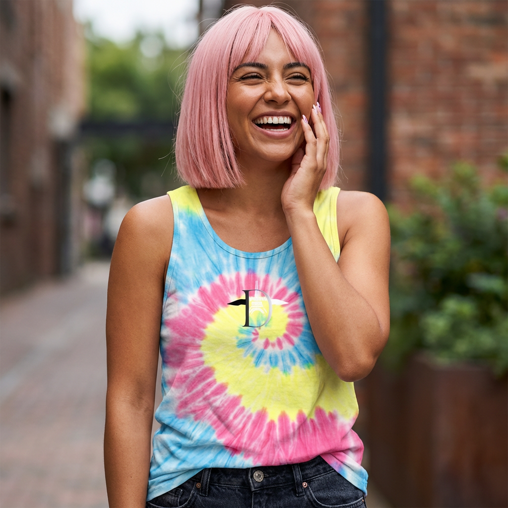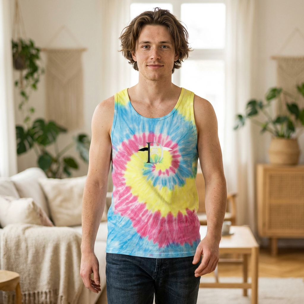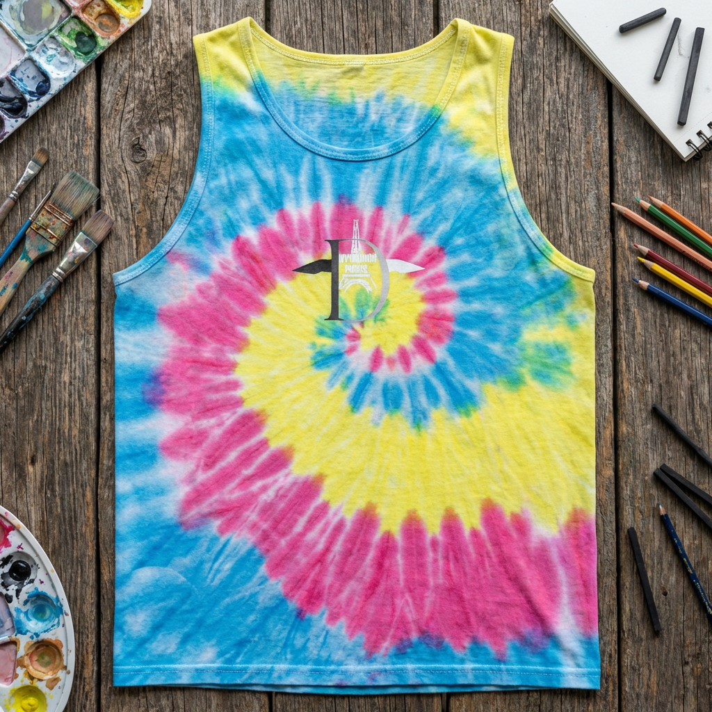 Ce débardeur vintage léger diffuse une énergie estivale et décontractée. Confectionné en coton doux et respirant, il se distingue par son motif spiralé aux teintes pastel — jaune, rose et bleu ciel — évoquant les matinées ensoleillées à la plage ou les après-midis festifs en plein air.